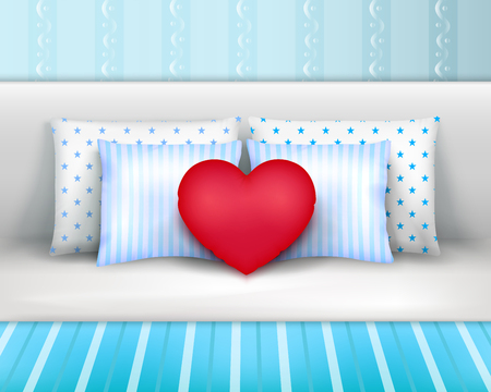 ストライプのベッドリンネンとハート型のクッションベクトルイラストを持つヘッドボードのリアルな組成でベッドにセットされた枕 のイラスト素材 ベクタ Image